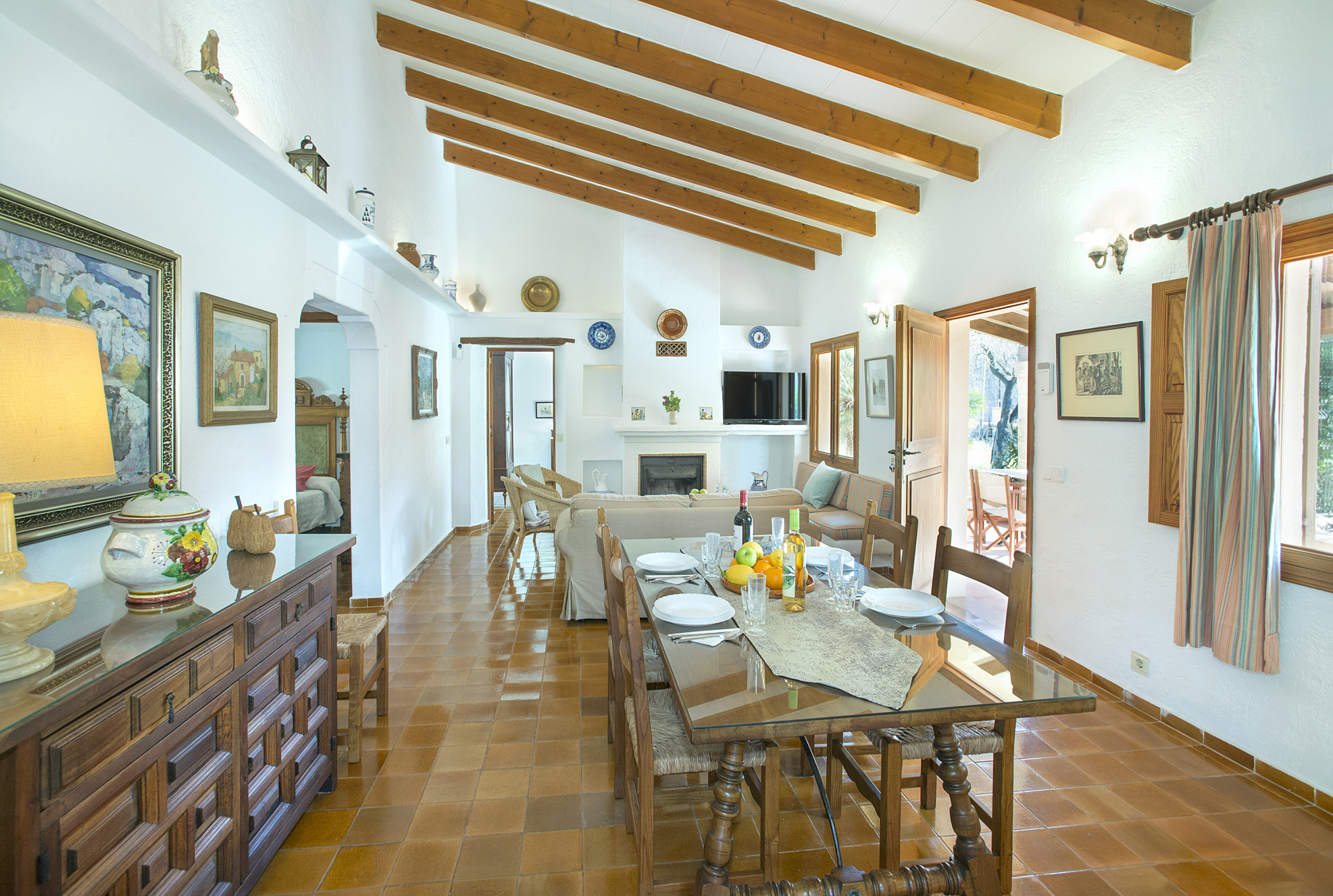 Das Haus befindet sich komplett auf einer Etage und zeichnet sich durch eine helle Fassade und eine elegante Steinverkleidung auf der Rückseite aus. Große Fenster lassen viel natürliches Licht herein und schaffen eine warme Atmosphäre. Der Haupteingang führt in einen großzügigen Wohn- und Essbereich mit bequemen Sofas, Sesseln und einem Esstisch aus Holz, der an den mallorquinischen Stil erinnert. Hohe Decken mit sichtbaren Holzbalken und weiße Wände unterstreichen den traditionellen Charakter.