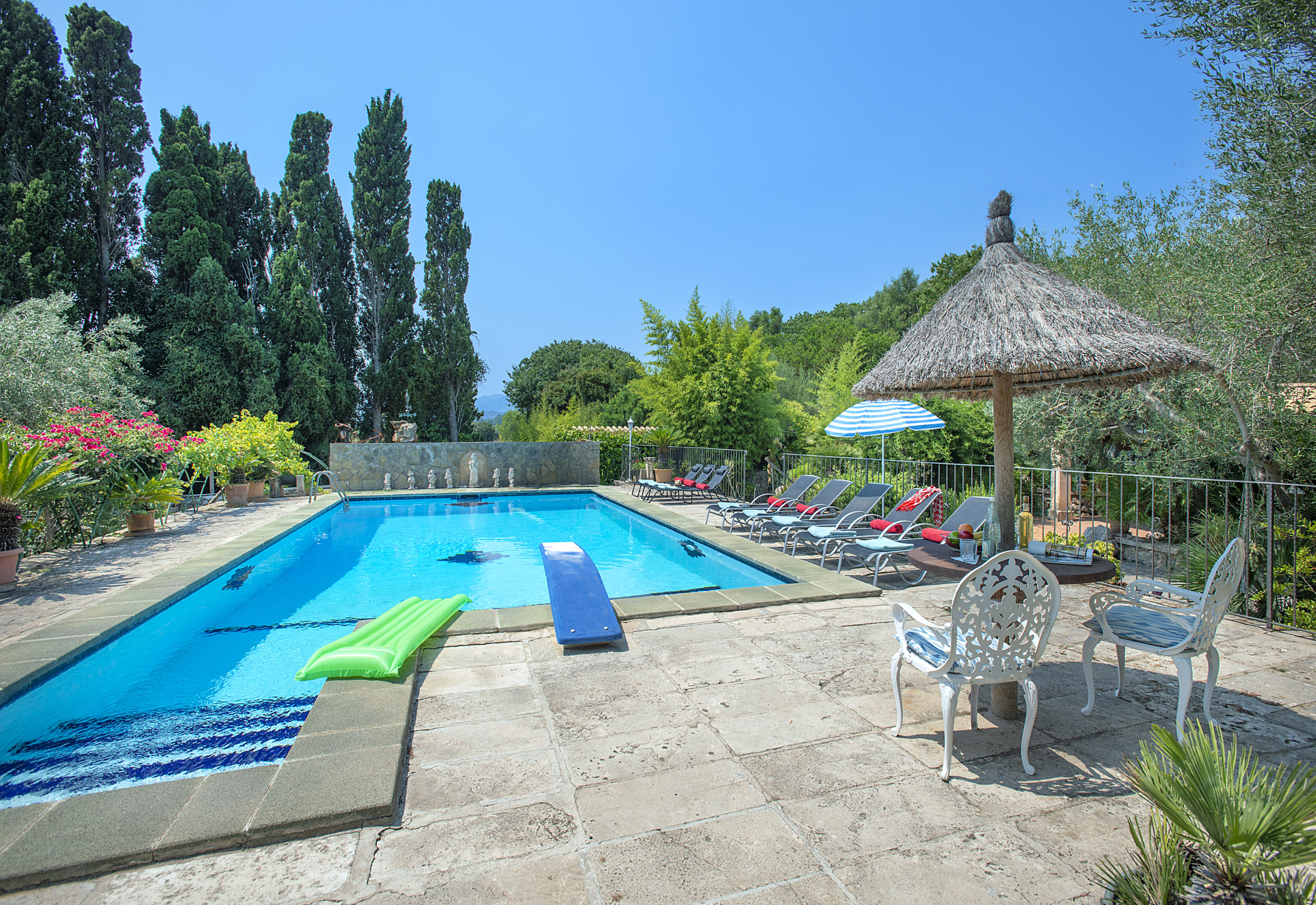 Der Außenbereich der Finca Far eignet sich ideal zum Schwimmen oder Sonnenbaden. Beim Entspannen oder Essen in der Finca genießen Sie den Blick auf die Silhouette des Tramuntana-Gebirges und die Umgebung der offenen Landschaft. Der Tisch und die Stühle sind vor der Sonne geschützt und der fantastische Grill garantiert unvergessliche Grillereignisse.