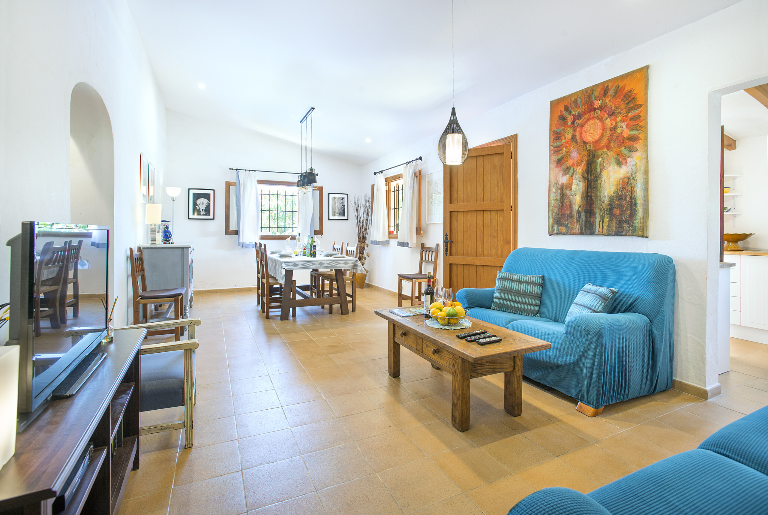 La casa está construida en un estilo rústico típico de Mallorca, con una terraza amueblada que da al jardín y a la piscina con su área de césped. La terraza y el jardín ofrecen vistas a las montañas de Tramuntana y al monasterio de Puig de María cerca de Pollensa. La piscina mide 8 por 4 metros y no está vallada, como es típico en Mallorca.