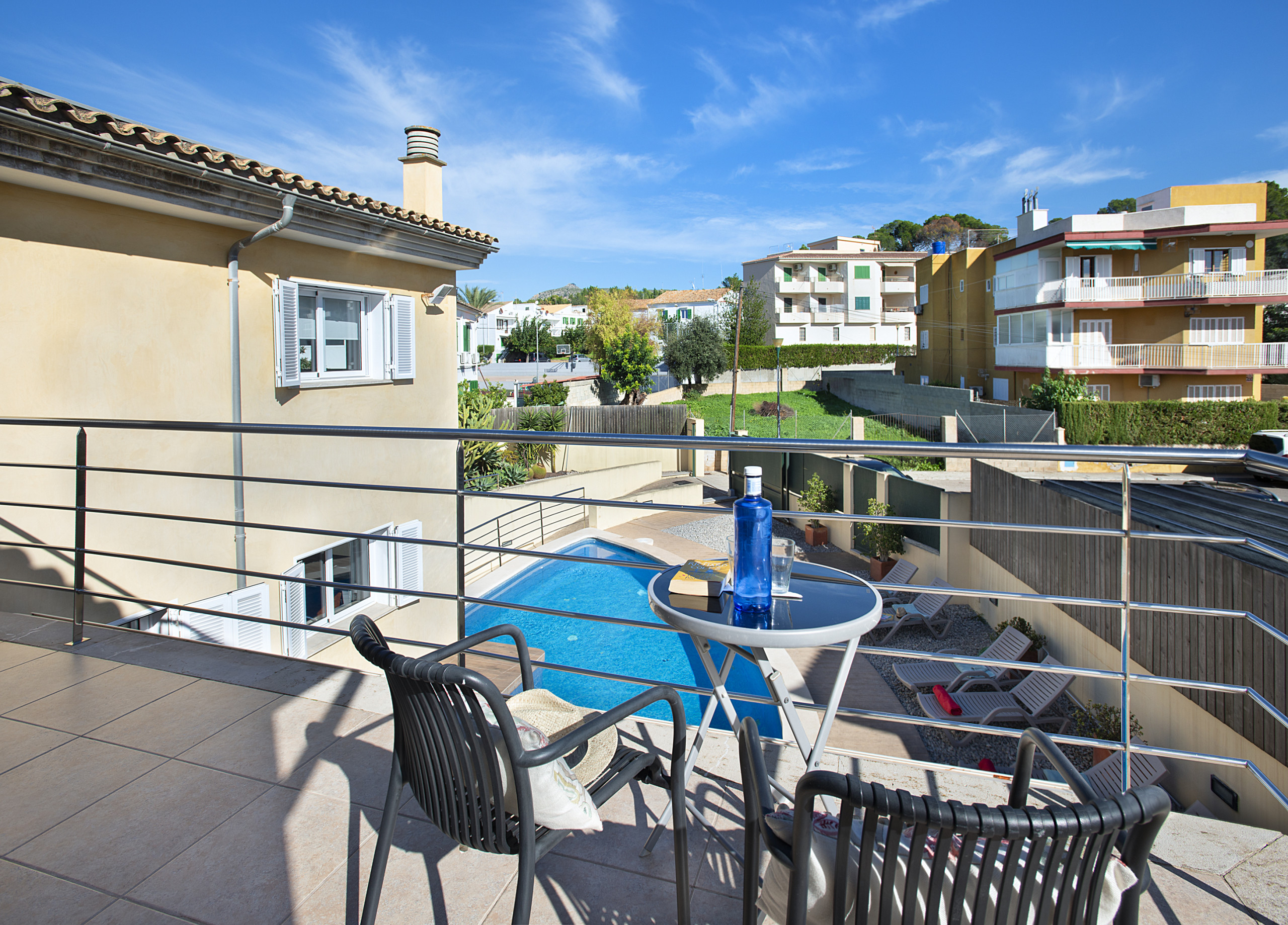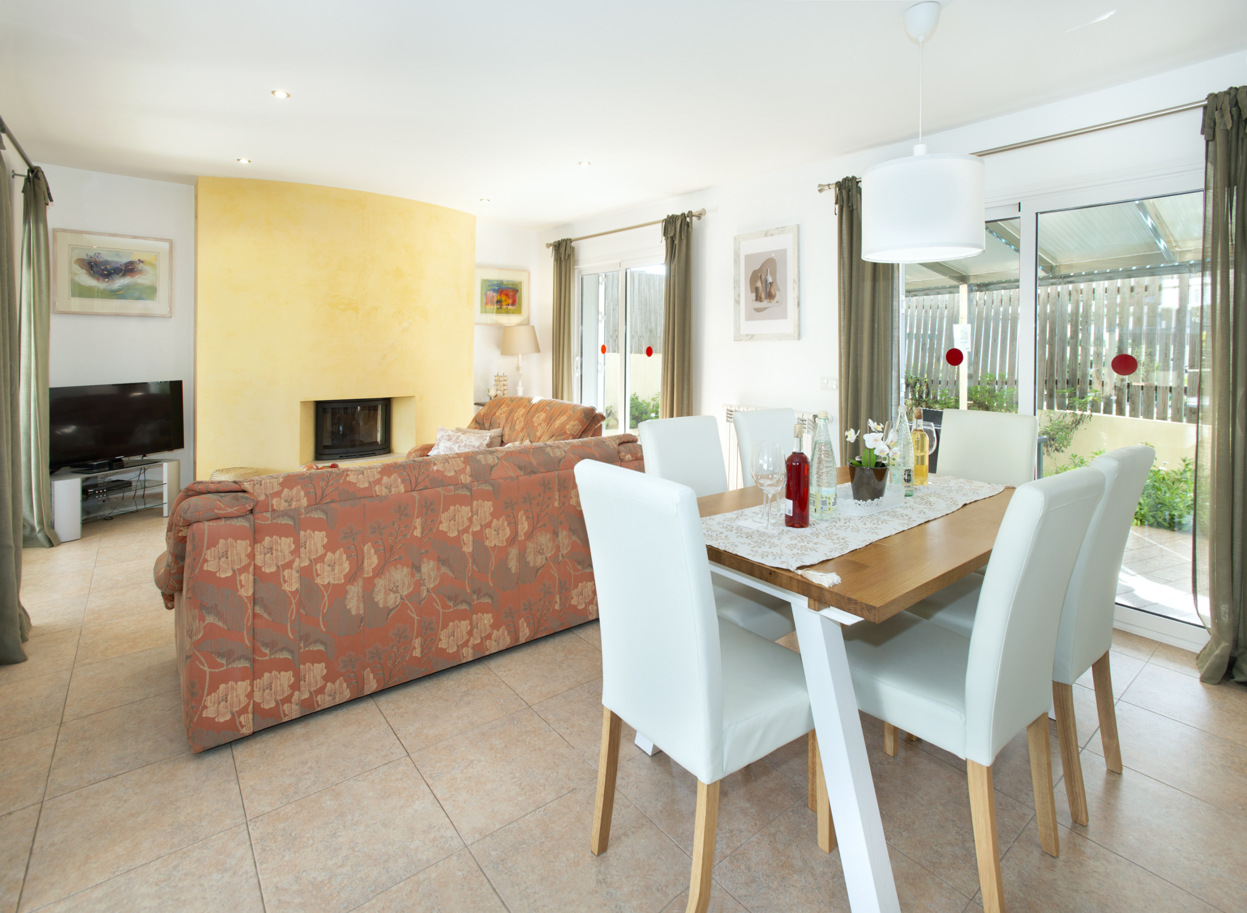 Outside, Villa Can Gaya offers two areas with tables and chairs: one next to the pool, perfect for sunny breakfasts, and another at the back, accessible from the living room and kitchen, ideal for outdoor dinners. You can park comfortably in front of the house, although the garage is used as a games and laundry area. The property does not have a barbecue.