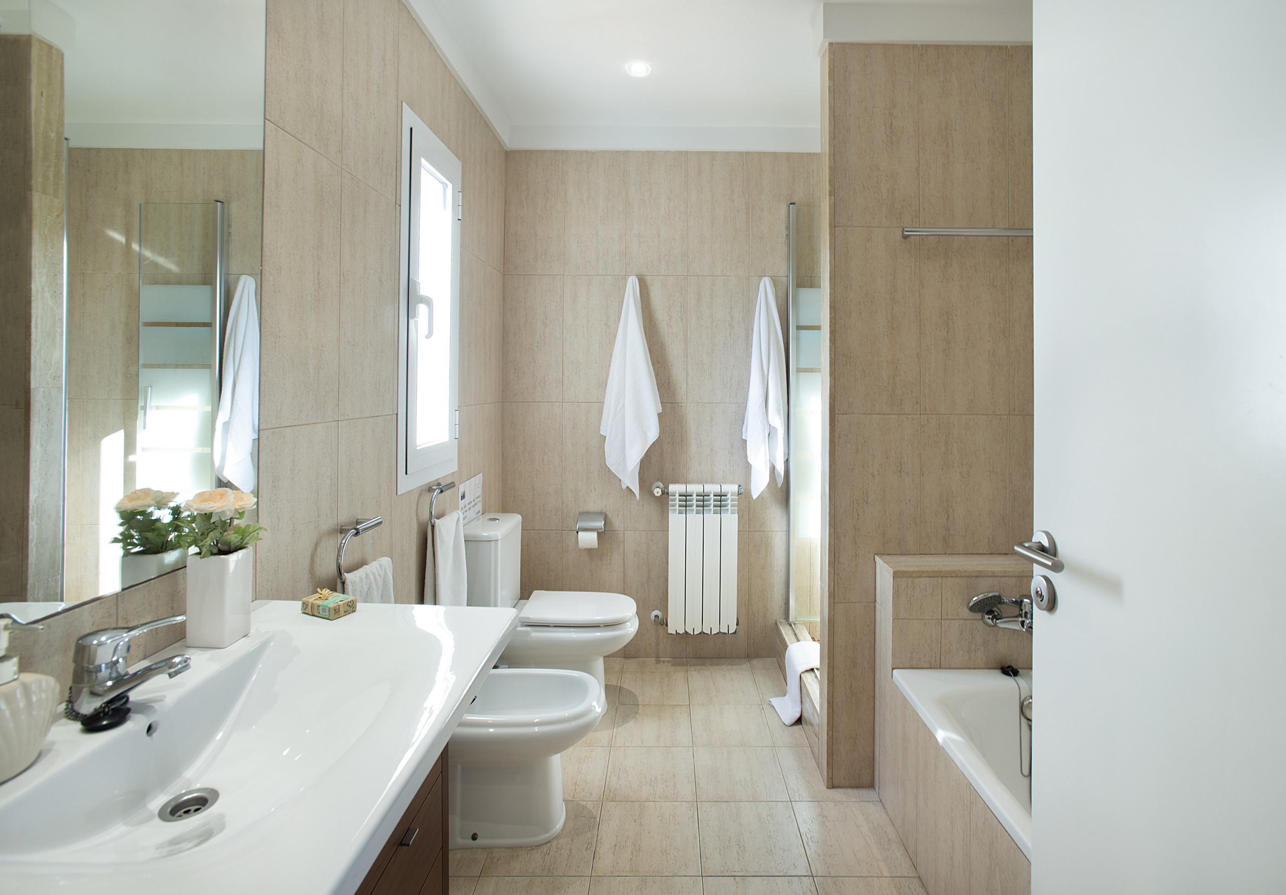 On this same level, there is also a double bedroom. The upper floor features three bedrooms: one with a double bed and an en-suite bathroom with separate bathtub and shower; another with two single beds; and a third bedroom with two single beds plus an extra bed, ideal for families with children. On this level there is also a second full bathroom, also with separate bathtub and shower.