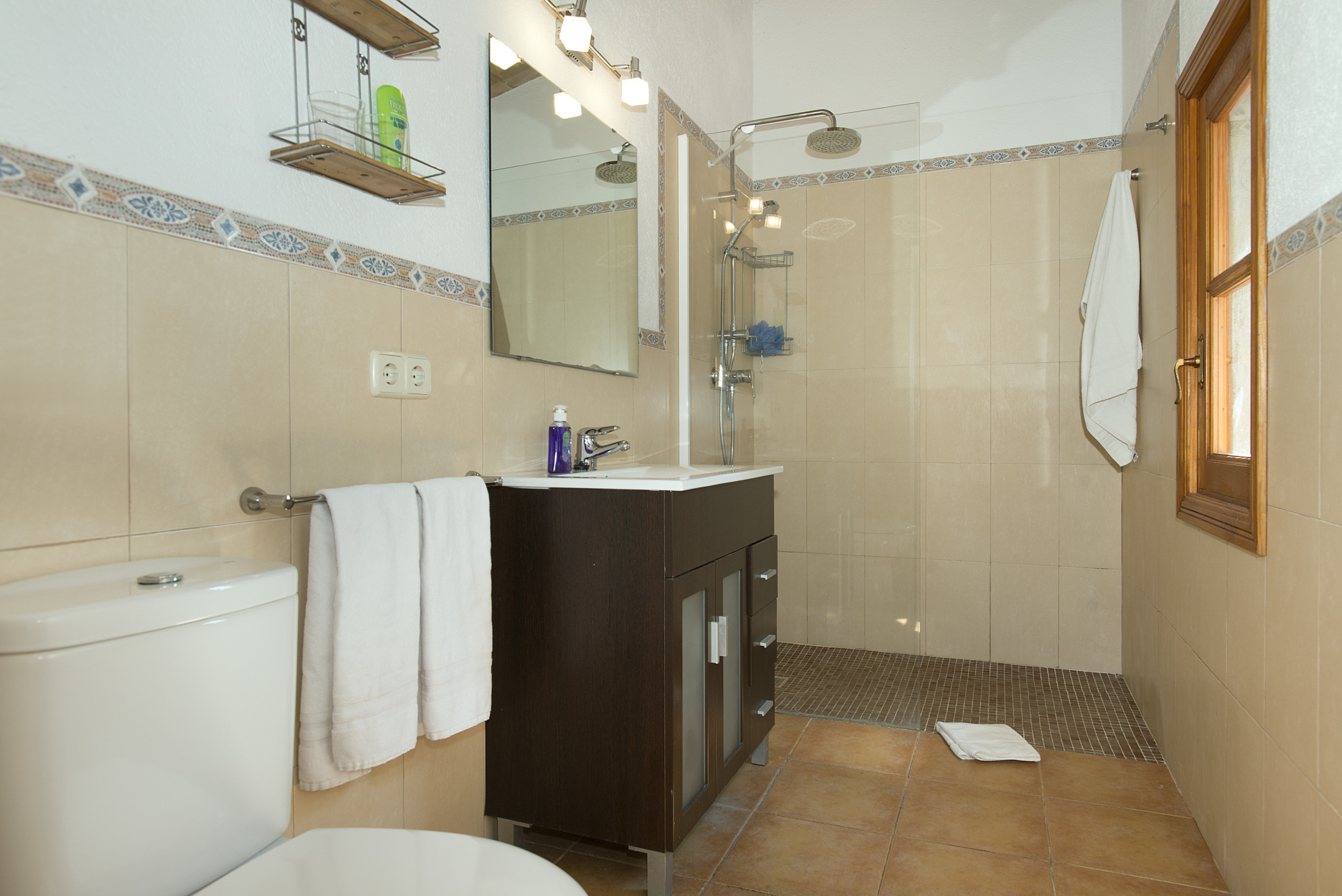 On the upper floor there are three bedrooms: one with a double bed and en-suite bathroom with separate bathtub and shower, another with two single beds, and a third with two single beds plus an extra bed, ideal for families with children. On this floor there is also a second full bathroom with a separate bathtub and shower.